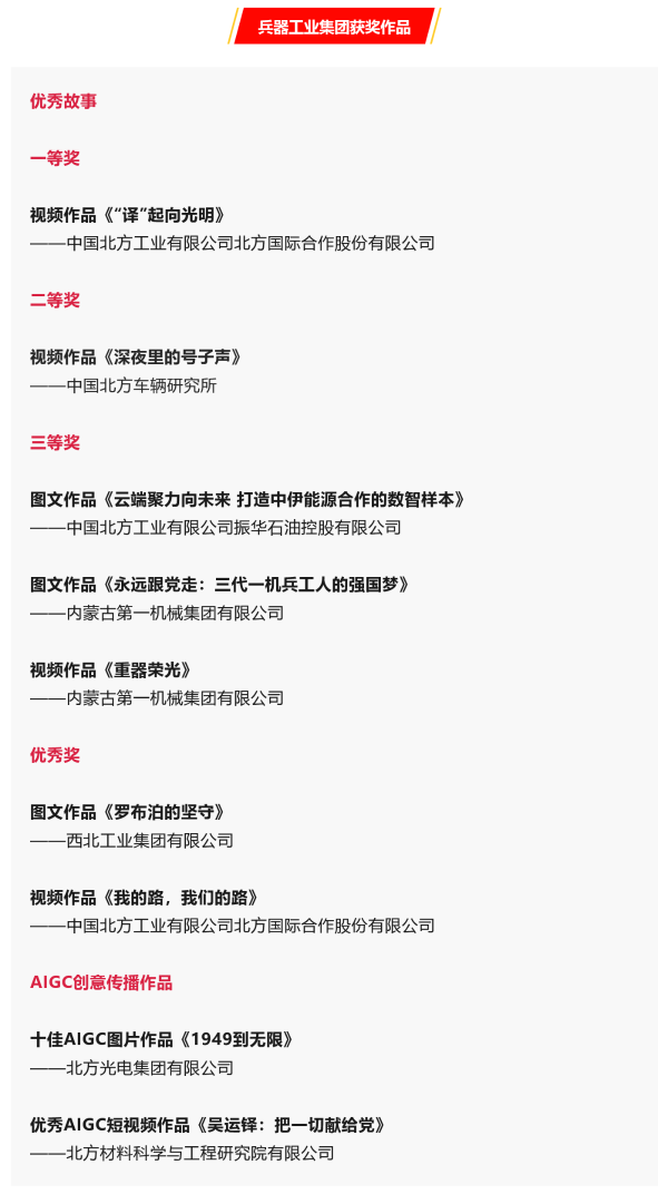 兵器工業(yè)集團(tuán)9件作品在第七屆中央企業(yè)優(yōu)秀故事暨AIGC創(chuàng)意傳播作品發(fā)布展示活動中獲獎