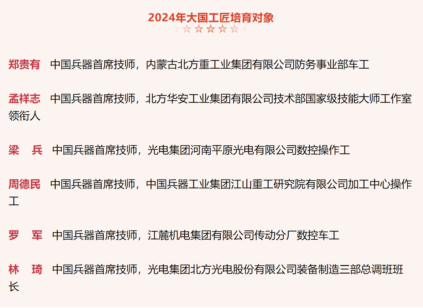 兵器工業集團6名高技能人才入選2024年大國工匠培育對象名單 |
